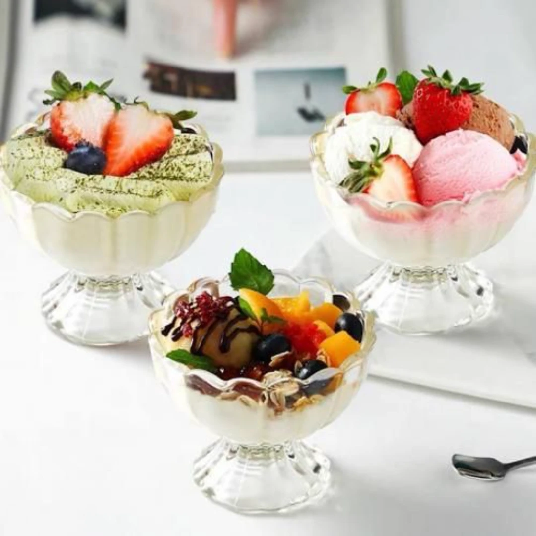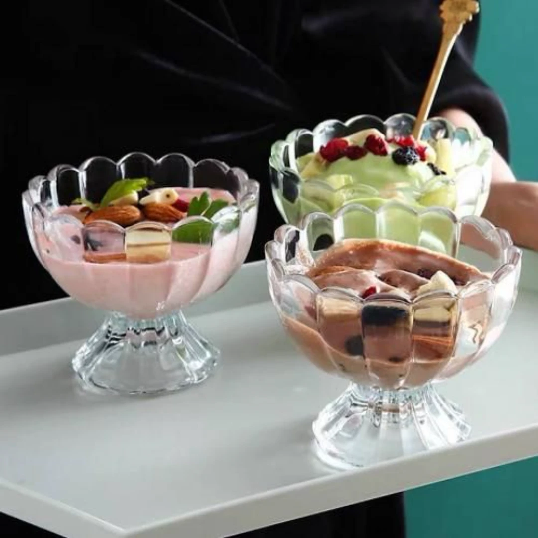 أكواب الآيس كريم وسلطة الفواكه هي الخيار المثالي لتقديم الحلويات بطريقة أنيقة وممتعة. تتضمن المجموعة 6 أكواب زهرية الشكل، مصنوعة من الزجاج المتين، مما يجعلها مثالية لتقديم الآيس كريم، سلطة الفواكه، وغيرها من الحلويات.