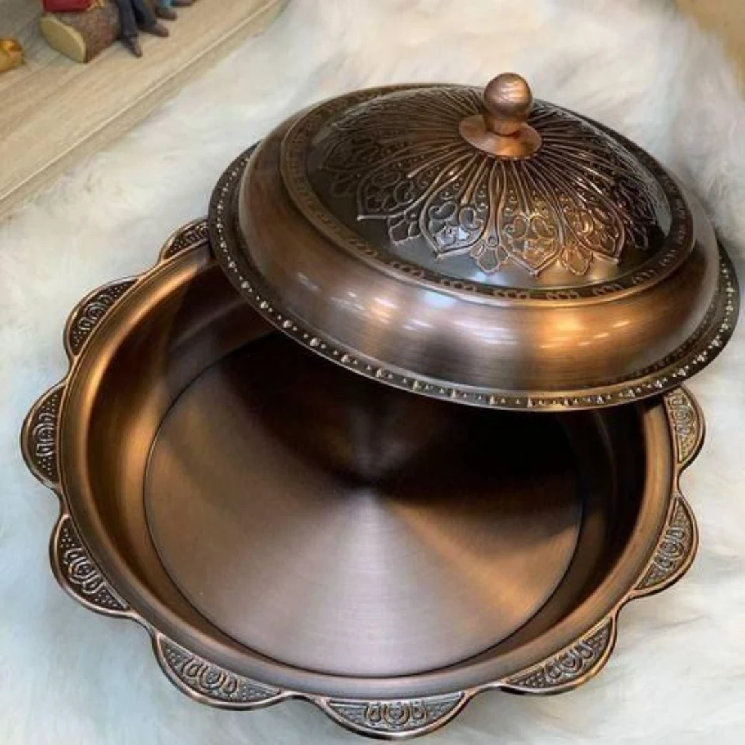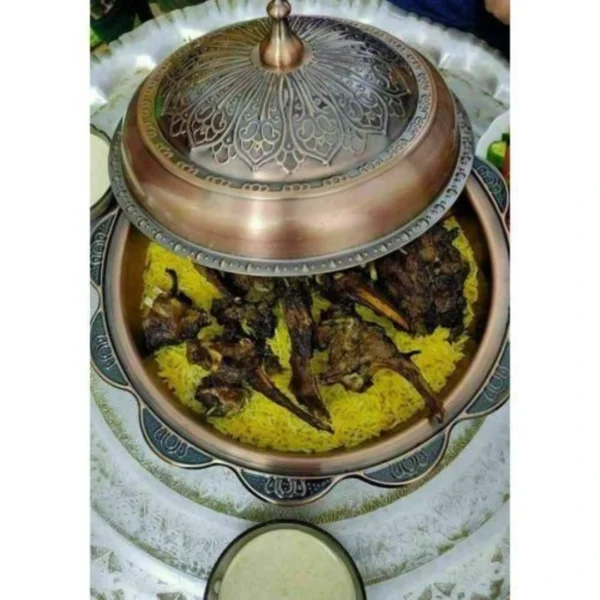 صينية تقديم كبسة ومندي مزودة بغطاء عربي هي الخيار المثالي للضيافة الأنيقة، مصنوعة من النحاس الثقيل لتقديم الأطباق التقليدية مثل الكبسة والمندي. تأتي هذه الصينية مع غطاء عربي يحافظ على حرارة الطعام ويضيف لمسة جمالية لمائدتك.