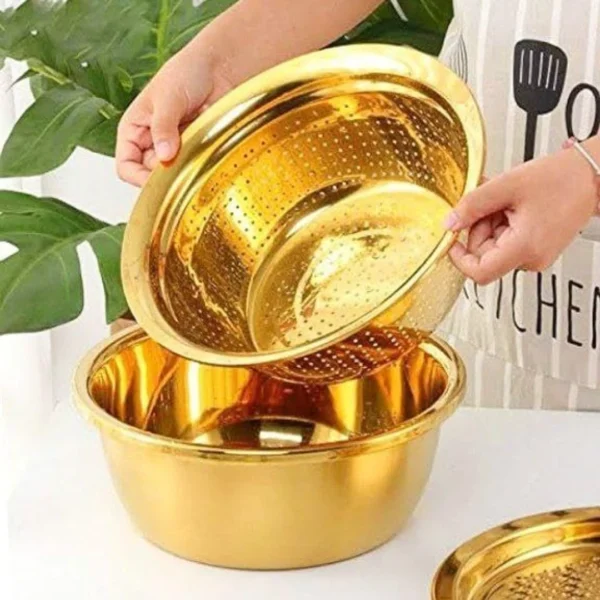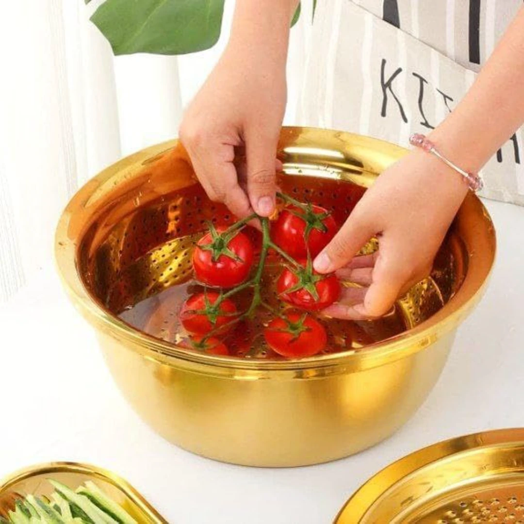 - يأتي الطقم مع عجان ومصفي متكامل ليكون حلاً مثالياً لمطبخك.