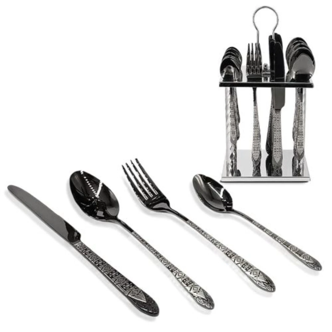 طقم أدوات مائدة مكون من 24 قطعة مثالي لتلبية جميع احتياجاتك في تناول الطعام، سواء في المناسبات العادية أو الاحتفالات. يتضمن الطقم ملاعق كبيرة وصغيرة، شوك وسكاكين، مما يجعله خياراً ممتازاً لكل مطبخ.