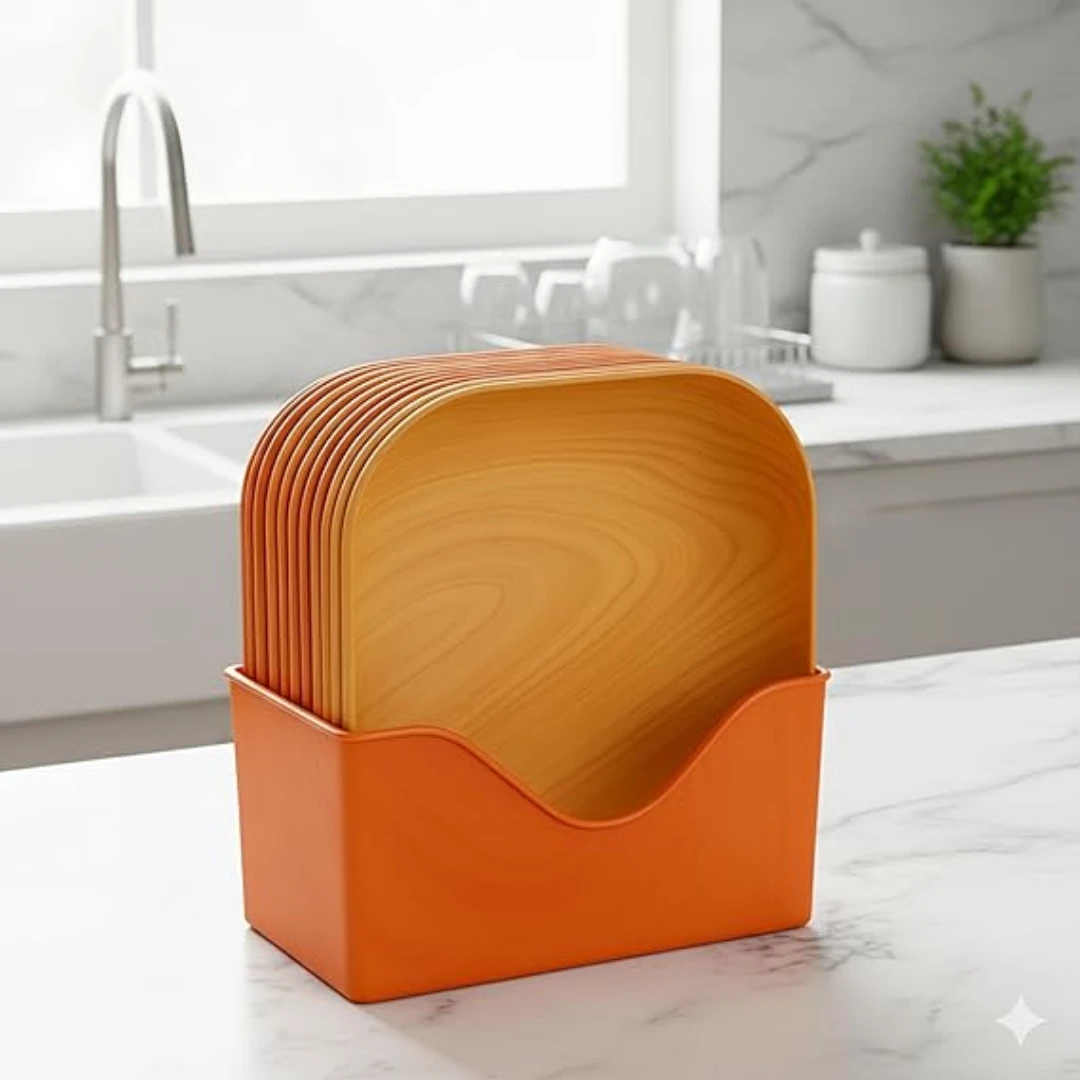 - مجموعة كاملة: طقم من 10 أطباق تقديم بلاستيكية بتصميم خشبي أنيق مع حامل تنظيم مدمج للتخزين المنظم