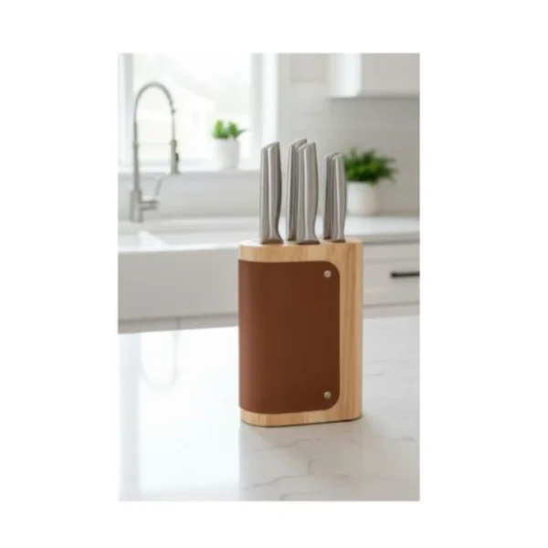 BRIGHT STONE طقم سكاكين ستانلس ستيل 5 قطع مع حامل خشبي فاخر مكسو بالجلد البني