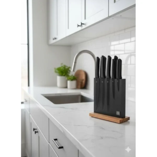 توفير المساحة: الحامل الرأسي النحيف لا يشغل مساحة كبيرة على “الرخامة” ويحافظ على شفرات السكاكين من الخدش الناتج عن وضعها في الأدراج العادية