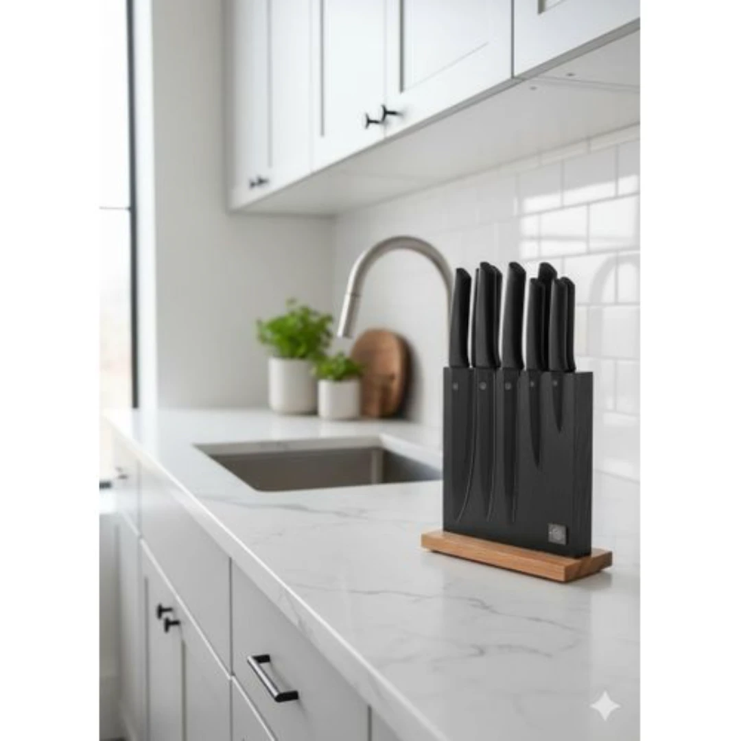 تصميم عصري وأنيق: يتميز الطقم بسكاكين ذات نصل أسود “مات” (Matte Black) تمنح مطبخك مظهراً فاخراً واحترافياً.