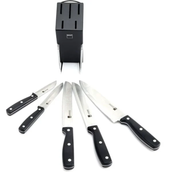 مجموعة سكاكين Magefesa مصممة لتلبية احتياجات المطبخ الحديثة، حيث تتميز بشفرات من الفولاذ المقاوم للصدأ عالية الكربون مع حواف تقطيع مشحونة بدقة. يمتد لون معدني كامل من طرف الشفرة إلى نهاية السكين، مما يوفر مزيدًا من القوة والتوازن والتحكم. تضمن هذه المجموعة زيادة السلامة والاستقرار أثناء الاستخدام، إذ أن الهيكل المصنوع من الفولاذ المقاوم للصدأ يخلق شفرة أكثر صلابة تقاوم البقع والصدأ والتنقر. تتضمن الطقم: سكين الطاهي، سكين الخبز، سكين التقطيع، سكين متعدد الاستخدامات، سكين التقشير، وحافظ السكاكين.