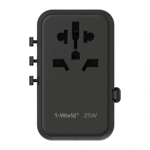 تم تصميم شاحن السفر 1-World+ ثلاثي المنافذ بقوة 25 وات لدعم الشحن السريع للهواتف الذكية والساعات الذكية والأجهزة اللوحية وأجهزة الألعاب المحمولة. وهذا يجعله حلاً مثاليًا ومبسطًا للشحن لأجهزة Android وApple